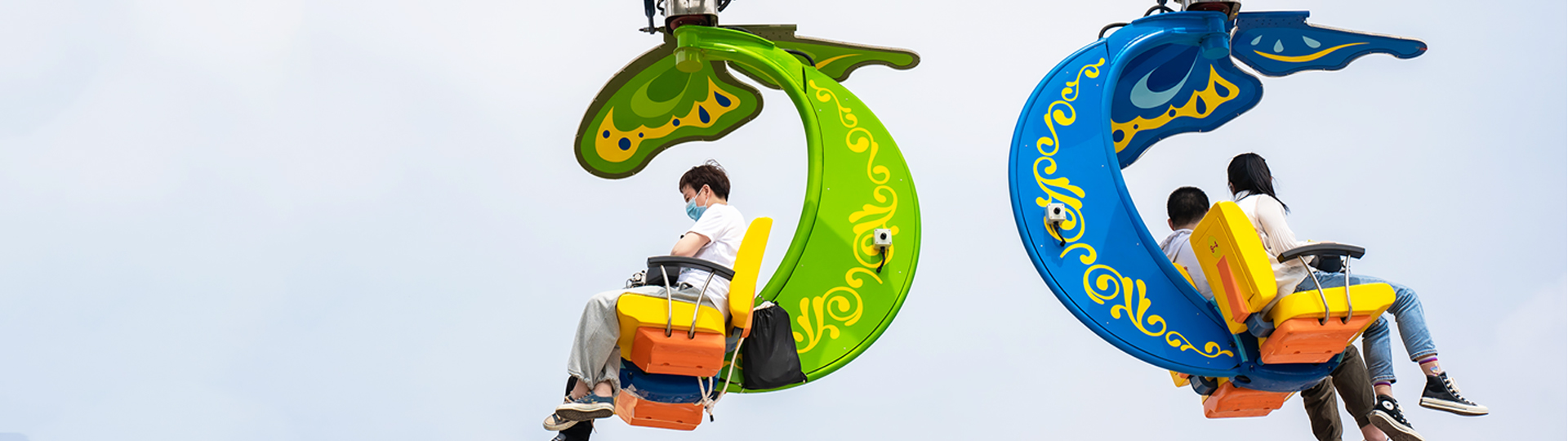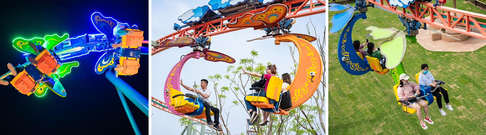 攬?游覽?以?亮為造型,?卡在??電機(jī)驅(qū)動下沿?平路軌??并帶動?卡兩側(cè)的翅膀扇動,運動?式獨特,外觀吸睛。同時懸掛的座艙可由乘 客通過?動搖桿控制旋轉(zhuǎn),增加游客操控趣味性。