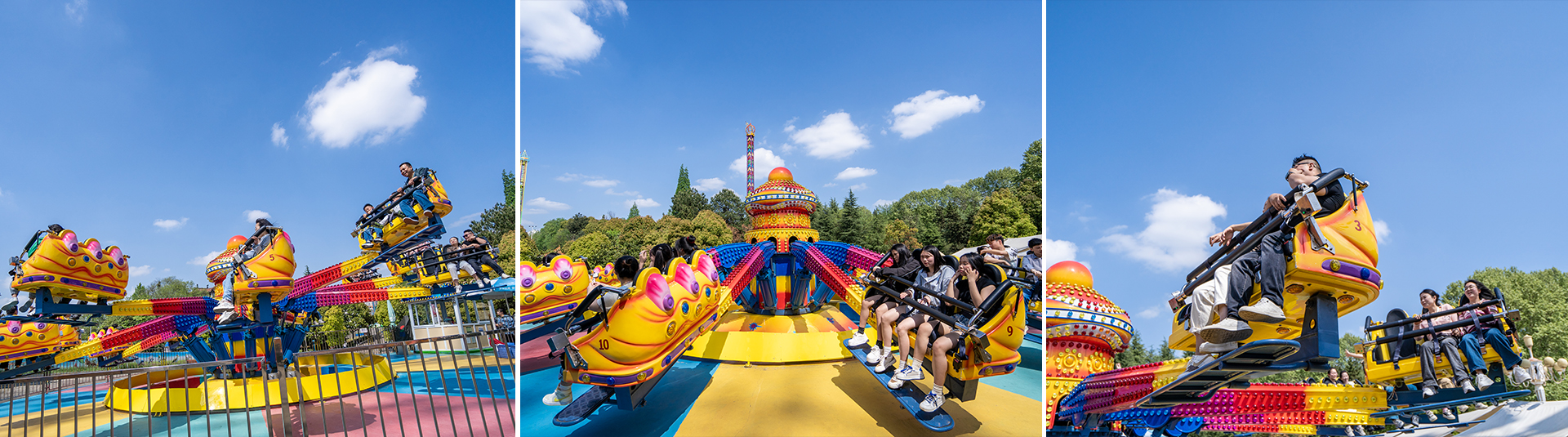 彈跳機(jī)中軸為中心帶動(dòng)周?chē)€(gè)座艙繞豎直中軸旋轉(zhuǎn),同時(shí)座艙伴隨著音樂(lè)進(jìn)行高低、快慢不同的跳躍式運(yùn)動(dòng)。使乘客在游玩過(guò)程中體驗(yàn)到旋轉(zhuǎn)加跳躍的樂(lè)趣。