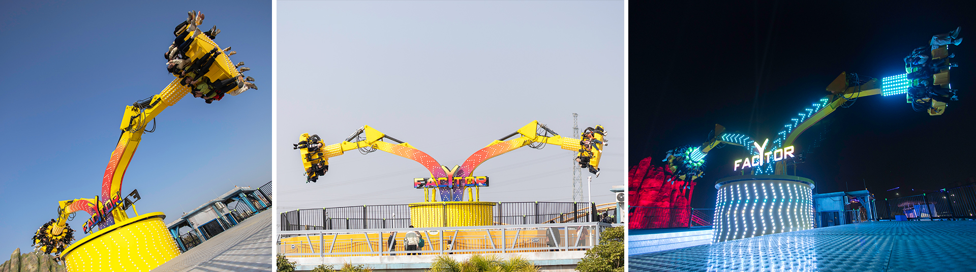 繞垂直軸旋轉、座艙繞支臂軸旋轉的陀螺類游樂設施;大臂向上拉升,到達上限位置后,座艙旋轉;傾斜運行、俯瞰大地,體驗翻倍;