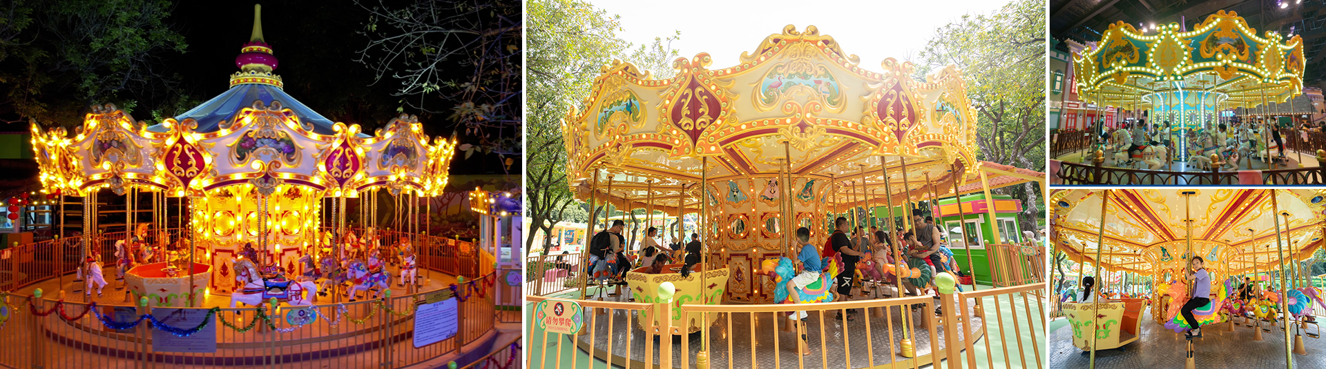 豪華轉(zhuǎn)馬采用歐洲皇家古典豪華的裝飾風(fēng)格,頂棚華麗,內(nèi)外圍板鑲嵌著彩色浮雕和絢爛彩燈,馬匹及宮庭式馬車結(jié)合多彩的花飾,造型精致小巧。